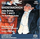 le livret du present sacd nous apprend que cette musique a ete popularisee grace au dernier opus de Kubrick "eyes wide shut" hors c’est oublier un peu vite que les jazz suite avait ete enregistre par DECCA dès le milieu des annees 90 par R. Chailly et le Concertgebouw d’Amsterdam et que celui-ci a ete très vite un veritable best-sellers d’où sans doute l’interêt du genial realisateur pour ce que l’on peut considerer comme un must de la musique "legère" de Chostakovitch. le Russian State Symphony Orchestra n’est pas le Concertgebouw d’Amsterdam, il n’a pas son opulance, son souffle, sa rutilance et son assurance. Non il n’a pas toutes ces qualites. Ailleurs c’eut pu être un defaut, ici ca relève d’une precieuse qualite: l’orchestre est fragile, comme en equilibre sur un fil, il avance dans la partition à la manière d’un Chaplin arpentant un trottoir, il en ressort une impression d’humour grincant, parodiant qui colle parfaitement à la musique qui reinvente le fox trot, le jazz, le tango... Pas d’envolee lyrique tonitruante mais une sensibilite tout en contraste entre rire et larme. Magnifique, car cette interpretation nous revèle l’essence même de la musique du "boulon" et des "jazz suites" de Chostakovitch. Je ne saurais conclure mon impression sans vous dire que la prise de son SACD magnifie dans toute sa superbe l’orchestre en captant superbement ses timbres et le geste de son chef (rendu dynamique notamment).