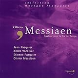 Le present compact-disc reprend un enregistrement de 1956 (pour "Le Club Français du Disque"), avec deux des interprètes de la creation (Etienne Pasquier et Olivier Messiaen), avec Andre Vacellier à la clarinette et Jean Pasquier au violon. Temoignage historique, même si l’interpretation est loin d’être un modèle de perfection technique. Tout d’abord, ce qui frappe l’oreille, c’est la mauvaise qualite sonore du report de l’oeuvre en compact-disc. Le piano est enrobe d’un voile sonore qui l’introvertit encore plus que ce qu’il n’y paraît. Les instrumentistes ne sont pas non plus exempts de tout reproches interpretatifs. Dans le cinquième mouvement "Louange à l’Eternite de Jesus" (pour violoncelle et piano), Etienne Pasquier use d’un incessant vibrato ; il en est de même pour Jean Pasquier dans le dernier mouvement "Louange de l’Immortalite de Jesus" (pour violon et piano). Dans le troisième mouvement "Abîme des oiseaux", Andre Vacellier semble fâche avec les nuances. Le piano d’Olivier Messiaen accompagne les trois autres compères avec sobriete (trop peut être ). Mais, comment ne pas être touche au plus profond de soi par autant d’implication, de franchise, de tendresse et tout simplement de liberte, par les quatre amis musiciens Par exemple, le sixième mouvement "Danse de la fureur pour les sept trompettes" (pour les quatre instruments à l’unisson), malgre quelques manques de justesse, demontre l’extrême connivence des interprètes. On pourra trouver des interpretations ulterieures plus reussies sur le plan technique (dont celle de Claude Desurmont, Luben Yordanoff, Albert Tetard et Daniel Barenboïm, pour DG), mais aucune n’atteindra le degre spirituel de celle-ci. Historique donc dans tous les sens du terme.